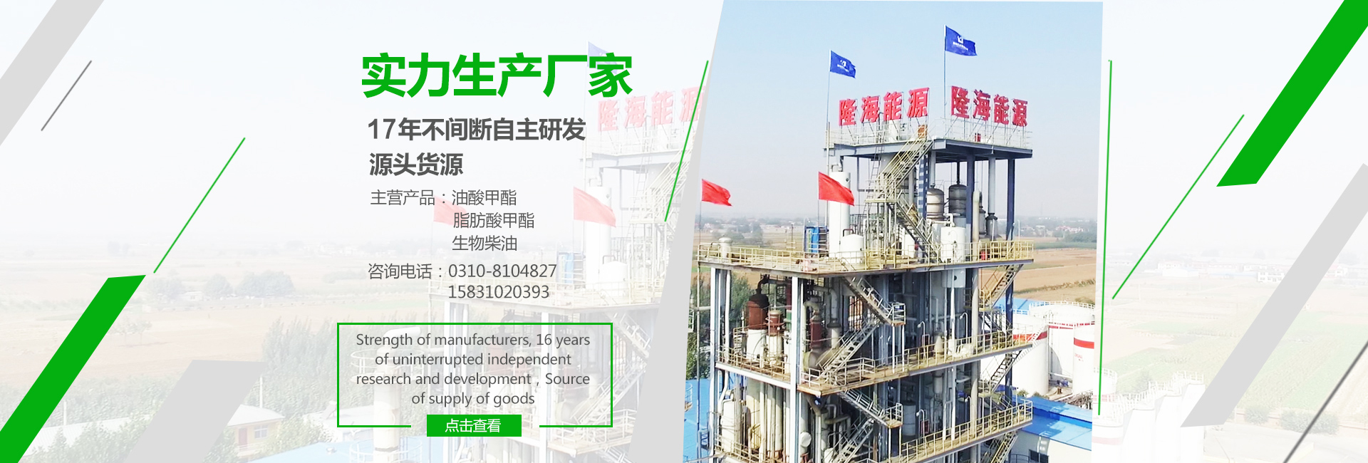 河北隆海生物能源股份有限公司,于2006年5月組建。公司坐落于河北省成安縣工業(yè)區(qū),交通方便,地理位置優(yōu)越,是擁有自己知識(shí)產(chǎn)權(quán)的高科技、新技術(shù)、專(zhuān)業(yè)設(shè)備研究開(kāi)發(fā)生產(chǎn)生物能源的專(zhuān)業(yè)公司。公司注冊(cè)資金1000萬(wàn)元,占地面積60畝,主要產(chǎn)品生物柴油和植物黑角(植物瀝青)已經(jīng)獲得有關(guān)部門(mén)的鑒定,并獲得用戶(hù)的認(rèn)可和好評(píng),產(chǎn)品在市場(chǎng)上供不應(yīng)求。 近年來(lái)公司快速發(fā)展進(jìn)步,利潤(rùn)比上年穩(wěn)步增漲、通過(guò)我們的技術(shù)創(chuàng)新使得生產(chǎn)線(xiàn)投入生產(chǎn)使產(chǎn)量大幅...